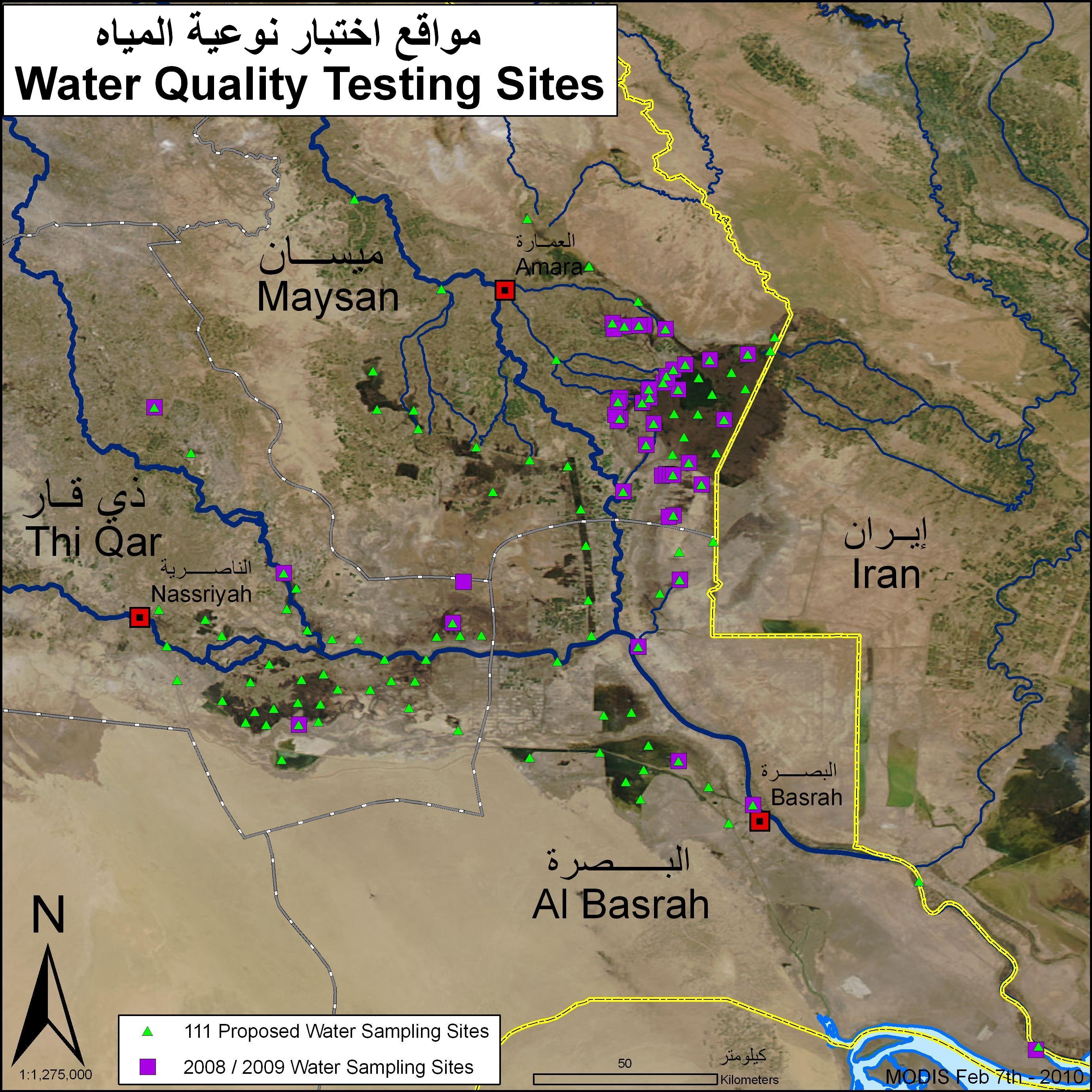 Water quality testing sites (past and proposed) for the marshes of southern Iraq. MODIS photo taken February 7th, 2010. Scale 1:1,275,000. Map extent (NSEW): 32 17'04", 30 30'59", 46 15'42", 47 59'14".