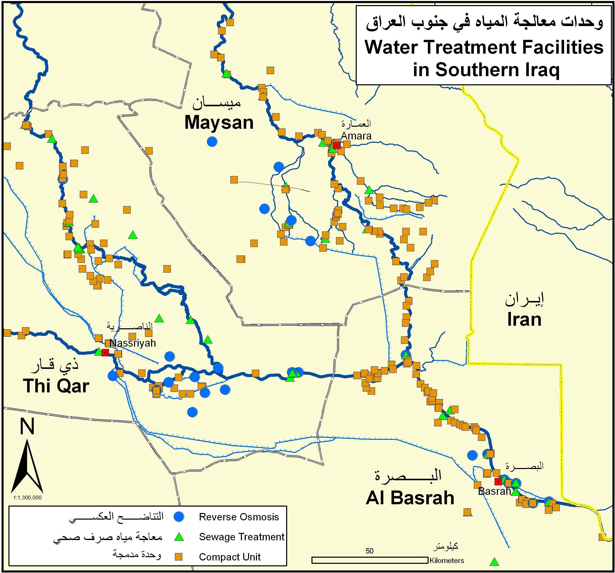 Water treatment facilities in southern Iraq (reverse osmosis, sewage treatment, and compact unit facilities). Scale 1:1,300,000.