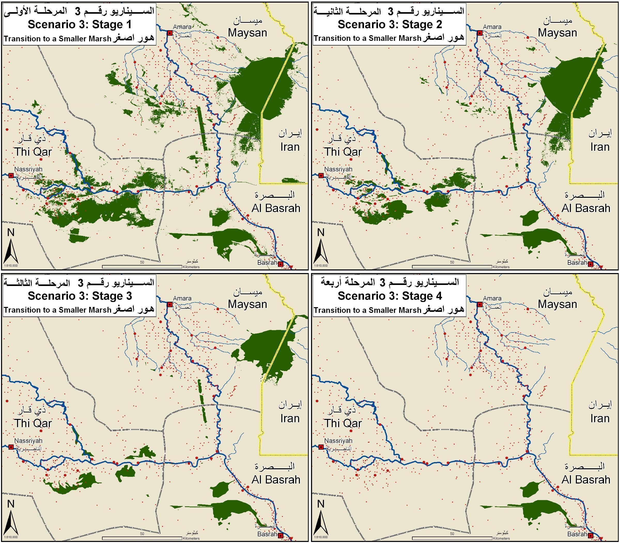 Scenario 3, shown in 4 stages. Displaying the drying of the marshes to roughly 5% of the former marsh extent. Scale 1: 810,000. Map extent (NSEW): 32 17'04", 30 30'59", 46 15'42", 47 59'14".