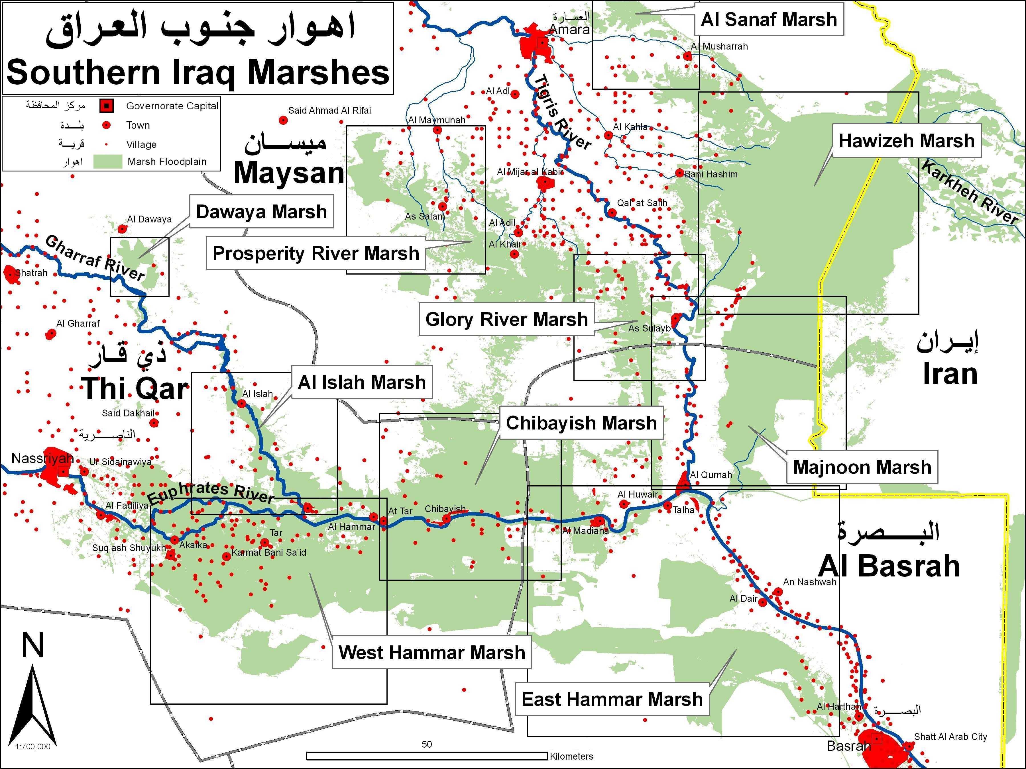 10 main marshes in southern Iraq. Scale 1:700,000.