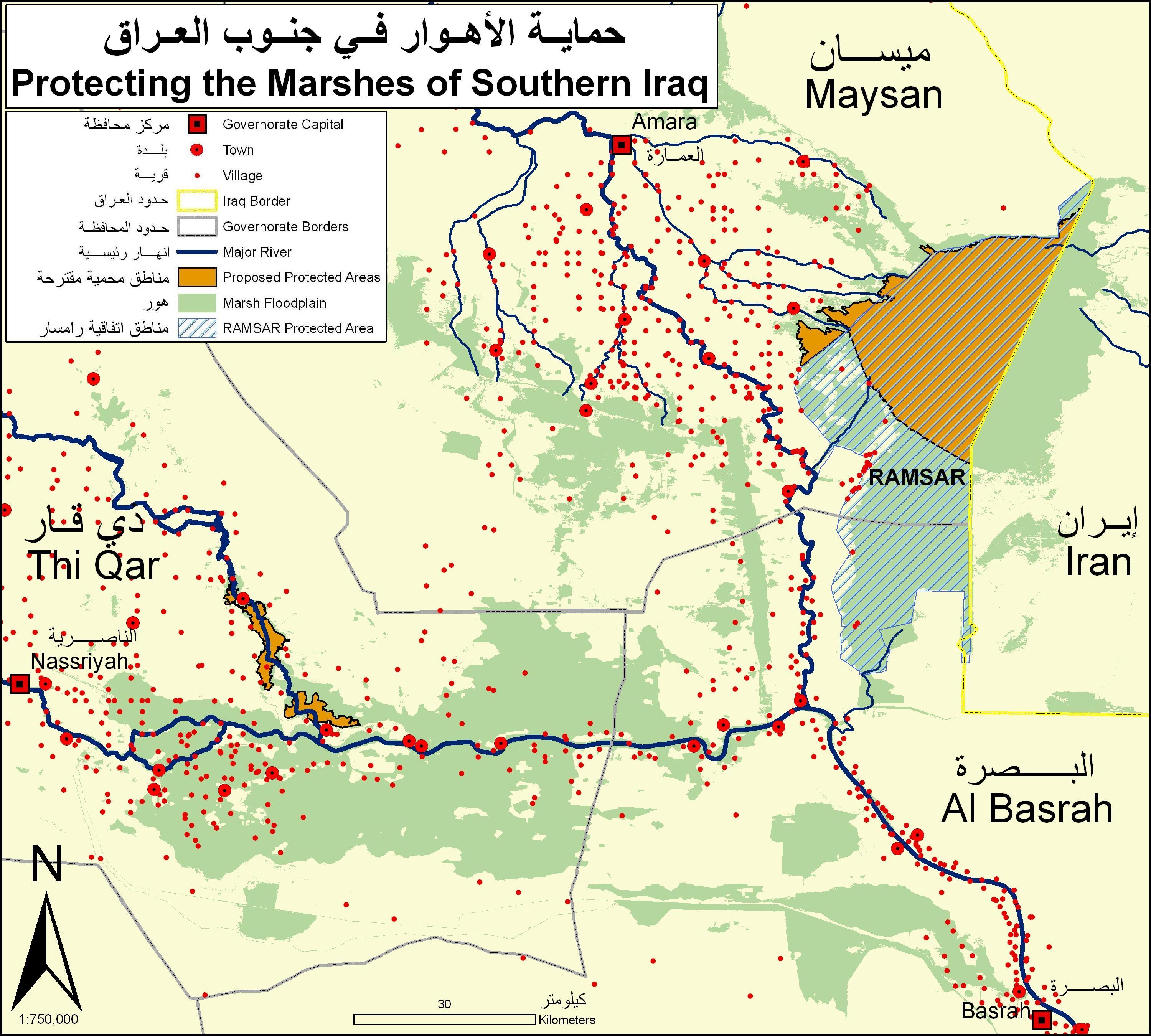 Proposed and existing protected areas in southern Iraq. Scale 1:750,000. Map extent (NSEW): 32 17'04", 30 30'59", 46 15'42", 47 59'14".
